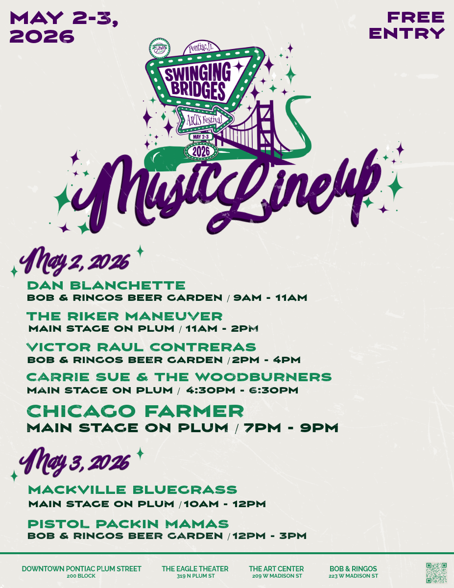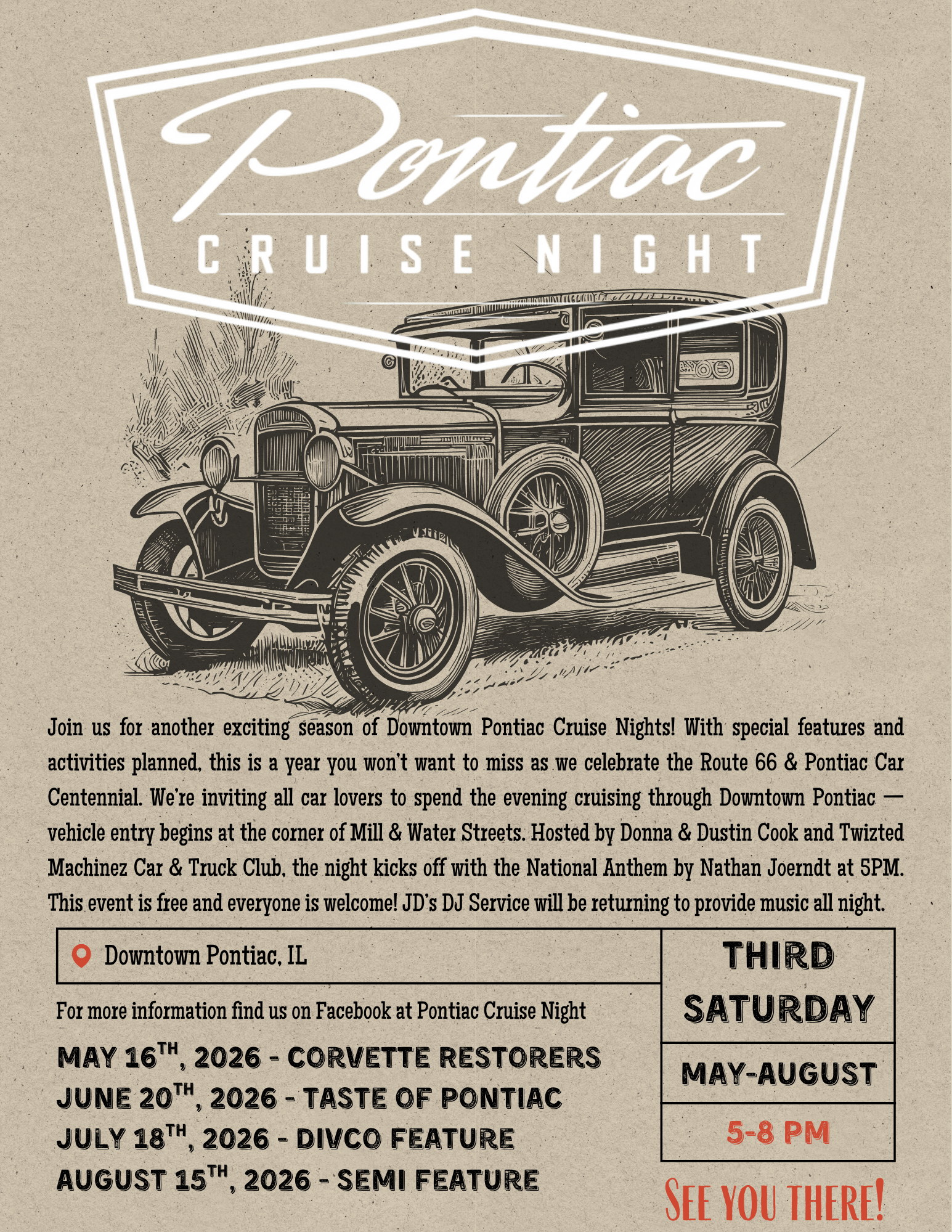 Join us as we celebrate the Route 66 & Pontiac Car Centennial with a full lineup of special features and themed nights you won’t want to miss. Car lovers are invited to cruise into Downtown Pontiac (vehicle entry at the corner of Mill & Water Streets) and enjoy an evening filled with classic cars, community, and nostalgia.